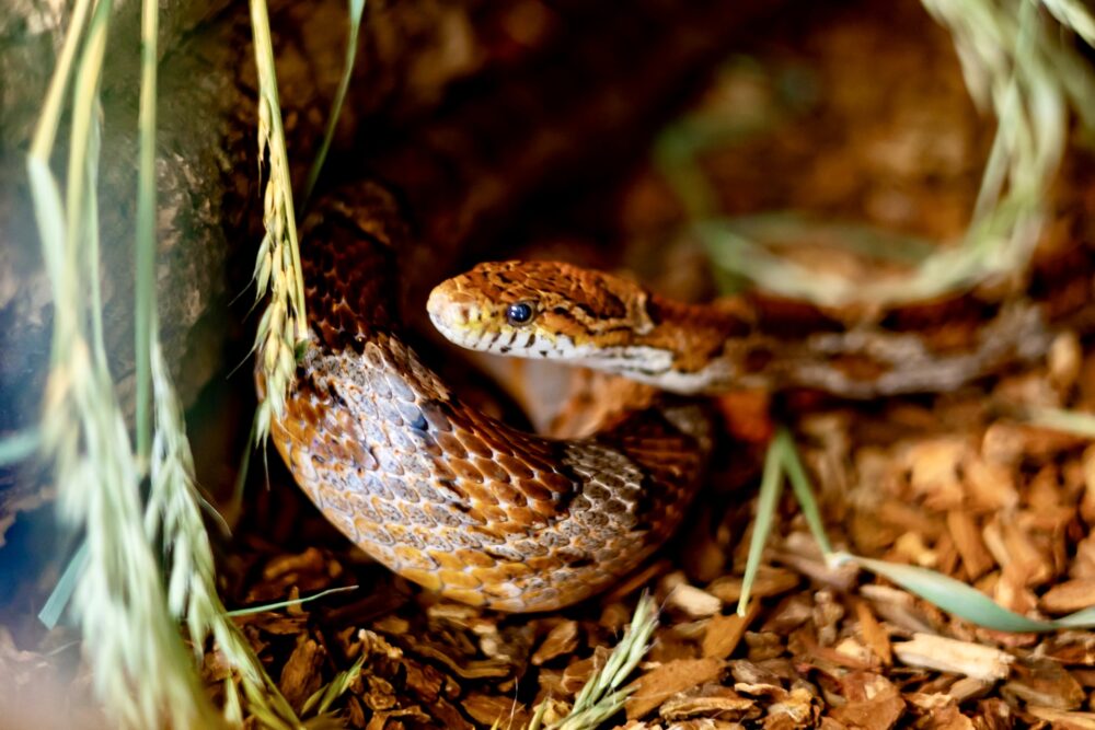 Knospe, eine Kornnatter mit ca. 1,50 Meter Länge, freut sich bereits auf ein neues und artgerechtes Zuhause. Das Terrarium sollte mindestens der Körperlänge entsprechen und mit feststehenden Ästen zum Klettern bestückt sein. Des Weiteren sind genügend Rückzugsorte, wie Höhlen oder Rindenstücke, unabdingbar. Als Bodengrund eignet sich ein Gemisch aus Erde, Sand und Lehm optimal, um ihm leichtes Buddeln zu ermöglichen. Boden sowie Rückzugsorte sollten immer leicht feucht gehalten werden, so dass die Luftfeuchtigkeit zwischen 50 und 70 % liegt.